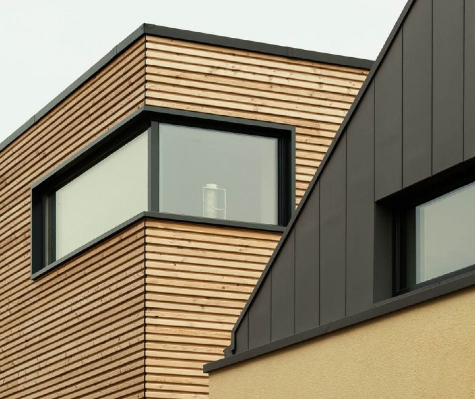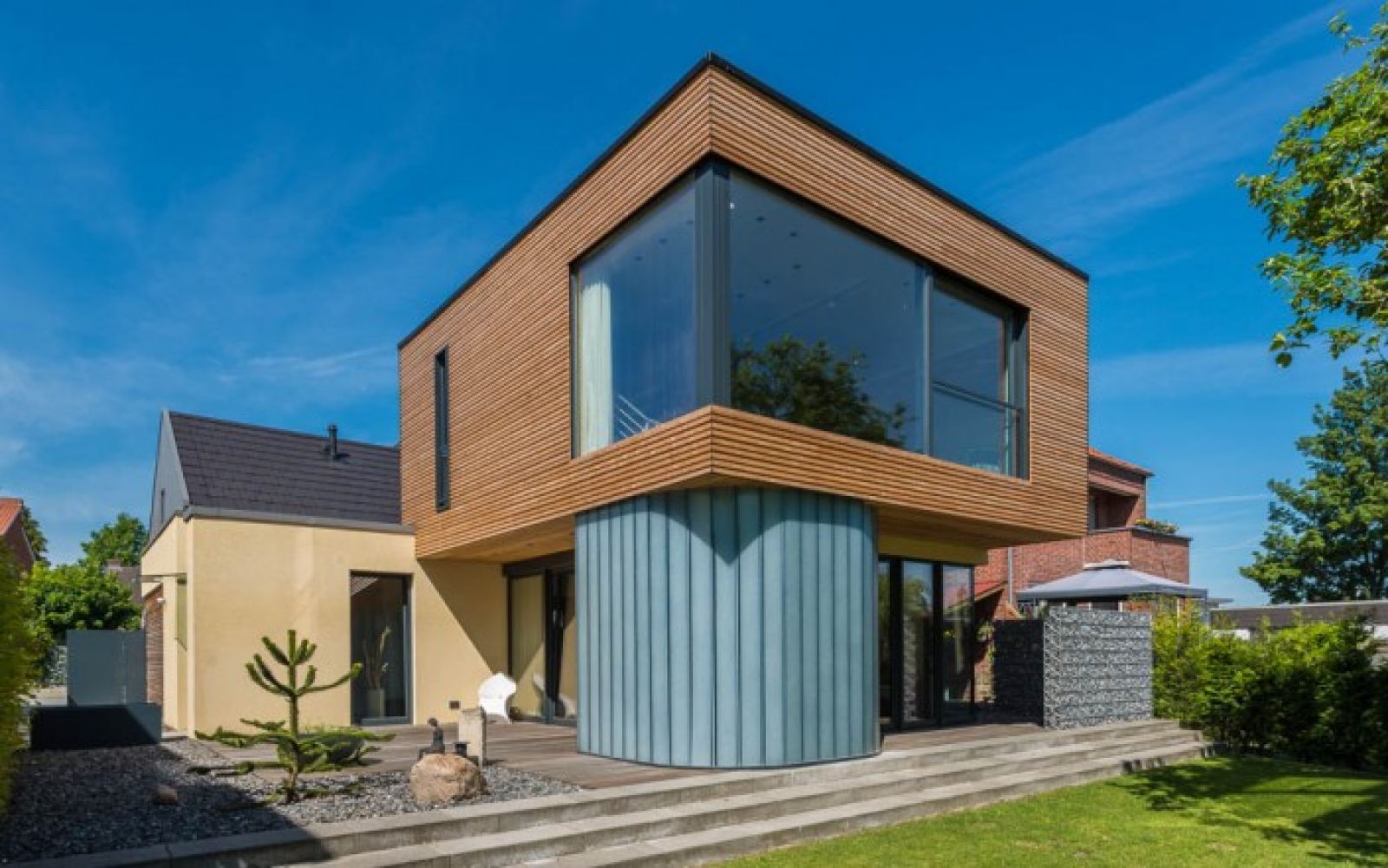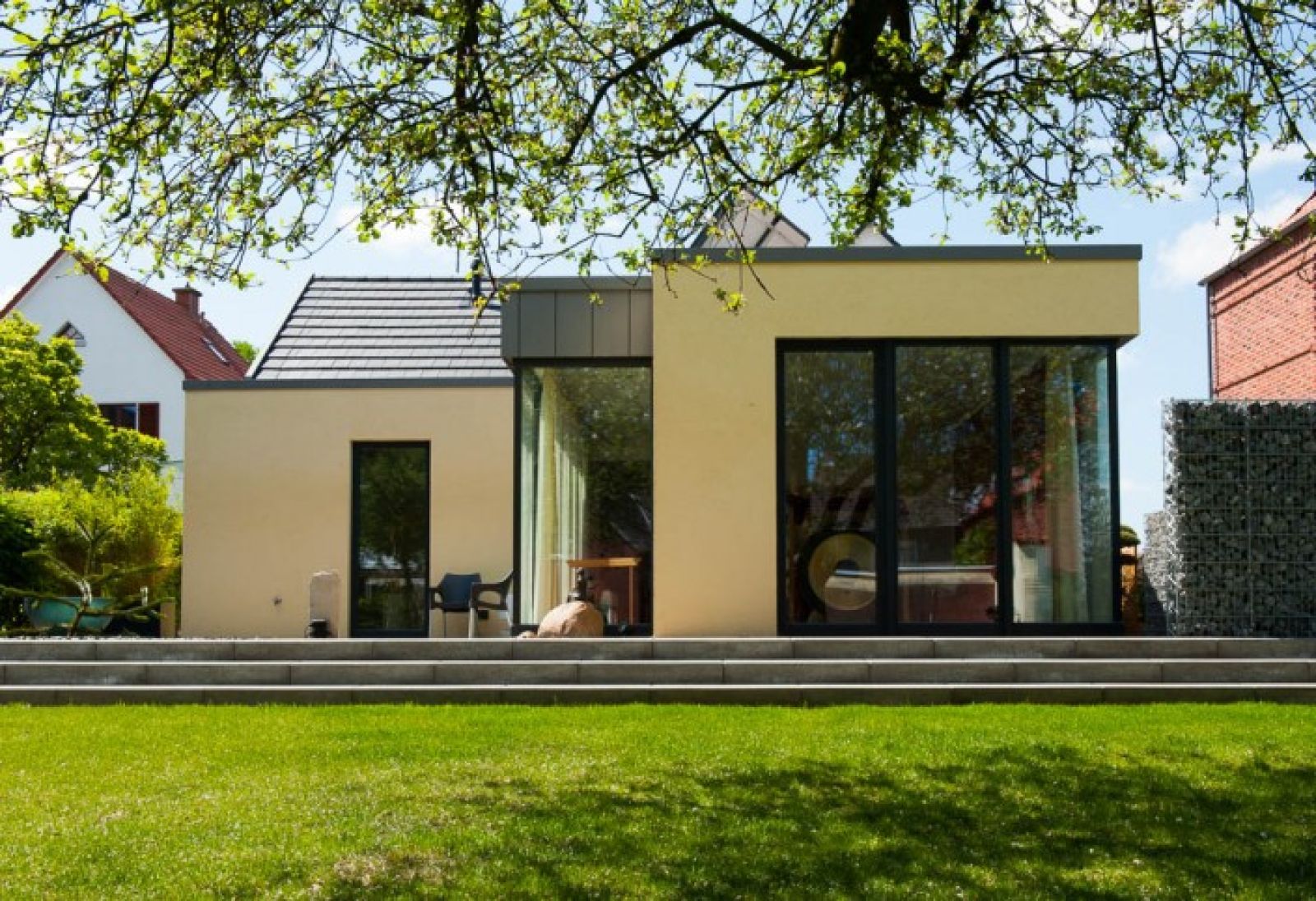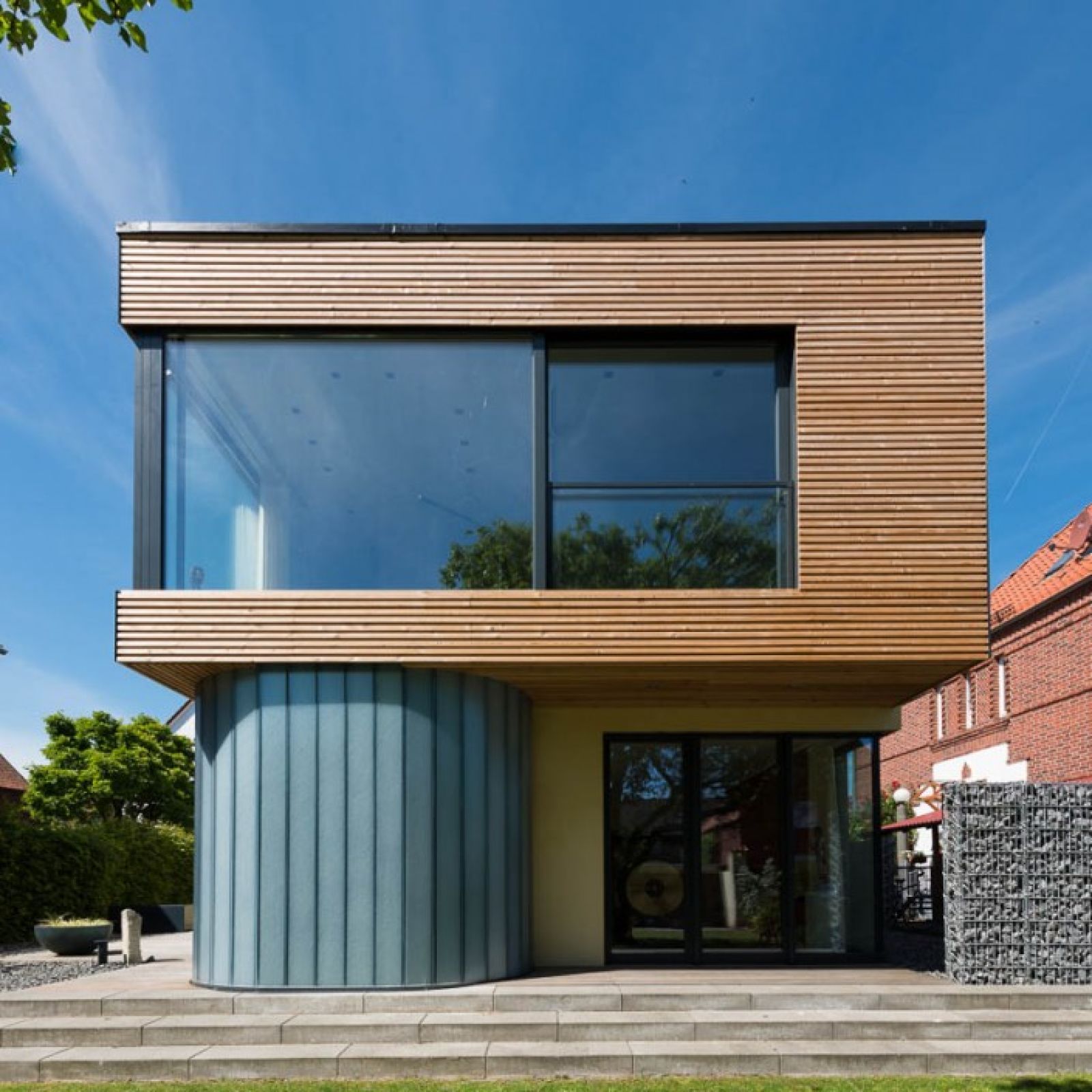 Der Bauherr wohnt gegenüber in einem gemütlichen Altbau und kaufte kurzentschlossen das freie Grundstück und baute ein kleines altengerechtes und barrierefreies Wohnhaus für 2 Personen. Aktuell wird das Haus als Heimstätte einer Klangtherapeutin genutzt und beweist seinen multifunktionalen Nutzwert. Das Gebäude hebt sich selbstbewusst von seiner umgebenden Bebauung ab und schafft durch seine Positionierung spannende Freiräume auf kleiner Grundstücksfläche. 2012 wurde eine Erweiterung realisiert